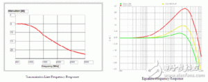 信號的高頻成分經(jīng)過PCB 走線或者電纜傳輸后相對于信號的低頻成分會被衰減得更多,此現(xiàn)象被稱為趨膚效應(yīng),它會破壞高速信號的信號完整性,使其眼圖關(guān)閉并增加信號抖動。為了補(bǔ)償趨膚效應(yīng),人們發(fā)明了均衡器、預(yù)加重器、去加重器來補(bǔ)償傳輸線頻率響應(yīng)的不平坦性。圖2 是一種傳輸線和均衡器的頻率響應(yīng)圖,傳輸線模型在高頻處會衰減得更多而均衡器在高頻處有更高增益,將均衡器的高頻增益設(shè)置成適當(dāng)?shù)闹担瑐鬏斁€和均衡器串聯(lián)后會形成在全頻帶內(nèi)大致平坦的頻率響應(yīng)。