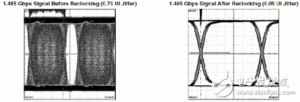 SDI 重定時器是用來自動檢測輸入信號類型,調(diào)整自身的PLL和CDR電路而恢復(fù)和整形出低抖動的時鐘,再重新定時發(fā)送出接收到的SDI信號,以降低SDI信號的抖動。雖然均衡器也可以降低SDI信號的抖動,但它和重定時器是兩種完全不同的器件,兩者不可相互替代。均衡器的作用是通過增加高頻增益使傳輸通道頻率響應(yīng)趨于平坦來改善眼圖和信號抖動,而重定時器則是通過PLL和CDR來抑制和降低累加噪聲。如果SDI傳輸通道很長或者傳輸過程中被其他噪聲和干擾惡化,僅有均衡器還不足以改善信號的質(zhì)量,此時在均衡器輸出端再串接一個重定時器是一個理想的提高SDI信號質(zhì)量的方案。圖5描述了重定時器的去抖效果,可見眼圖和抖動被明顯改善。