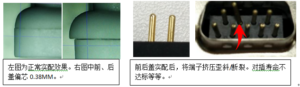 示例2:膠芯前后蓋不同芯,導致端子歪斜。除了會造成示例1中的異常問題以外,還會導致沖PIN公端擠壓斷裂、壽命不達標等問題。