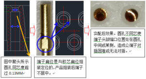 實配后效果。圓孔不同芯使端子頭部縮口位置處在圓孔中間或某側,造成公端子對插困難或無法對插。