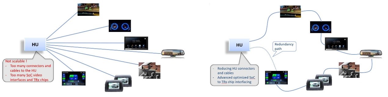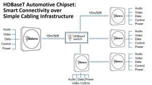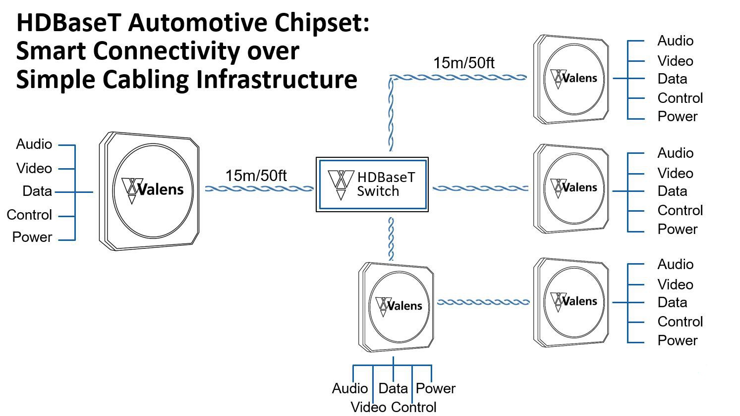 在邁向自動駕駛的過程中,除了車載傳感器的融合以外,我們也從Valens汽車電子事業部高級業務拓展經理鄧濤那里,了解了有線連接的融合方案。“車里面有很多東西要傳:音頻、視頻、以太網、控制、串口、電源等等。我們把所有這些信號,聚合到一根線上傳。”這實際就是Valens的HDBaseT車載芯片,通過一根線來實現智能連接。在高速、低延遲之外,“最小是2Gbps帶寬,4G/8G都有,明年我們會出16Gbps的”,實現一根線纜傳輸這么多信號“并不簡單,我們是多點到多點的通信,需要尋址、需要協議棧,我們將這套方案做好。視頻信號有視頻包頭,音頻信號有音頻包頭,可在10ms以內將數據直接恢復出來。”