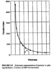 在電鍍工藝中,金在眾多暴露在表面的污點(diǎn)上成核,形成多孔性的電鍍表面。金鍍層的多孔性與鍍層厚度有一定的關(guān)系。在0.38μm以下,多孔性迅速增加。0.76μm以上,多孔性很低。多孔性和基材的缺陷,如包含物,疊層,沖壓痕跡,沖壓不正確的清洗等也有一定關(guān)系。