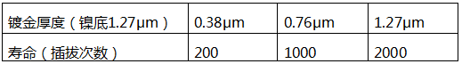 鍍層厚度直接影響連接器的壽命,行業(yè)內(nèi)有開(kāi)展相關(guān)的插拔試驗(yàn),論證鍍層厚度和壽命關(guān)系。某試驗(yàn)數(shù)據(jù)采用的是直徑為0.635 cm的端子,摩擦距離1.27 cm,正向力100g每個(gè)循環(huán)。