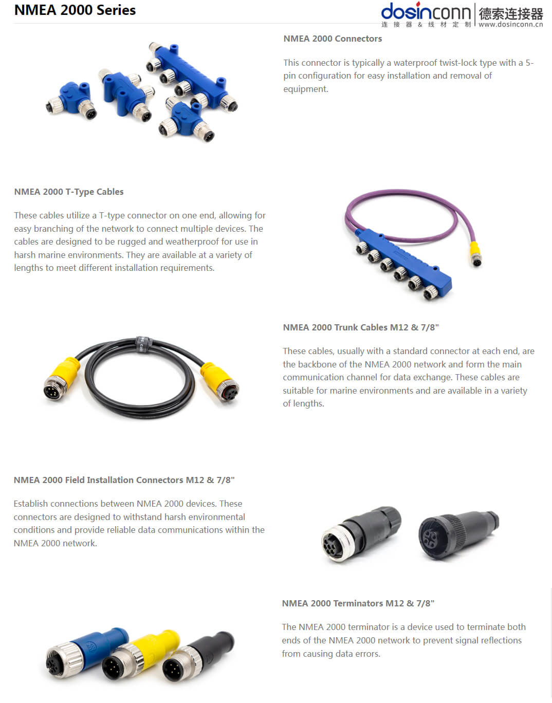 NMEA 2000 電纜用于連接NMEA 2000 船舶 設備及其骨干設備。NMEA 2000 電纜通常局限于長度為6米(20英尺)的成型式或組裝式的微型連接器,M12公頭/母頭5pin連接器與PVC / PUR外被電纜(22 awg * 1以及鋁箔包裝+ 24 awg * 1包裝)+地線+鋁箔+編織+屏蔽雙絞線。電纜長度可定制.
