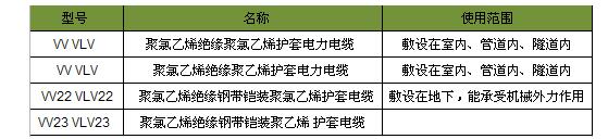 R-連接用軟電纜(電線),軟結構。 V-聚氯乙烯絕緣或護套。 B-平型(扁形)。 S-雙絞型。A-鍍錫或鍍銀。 F-耐高溫。P-編織屏蔽,P2-銅帶屏蔽,P22-鋼帶鎧裝;Y—預制型、一般省略,或聚烯烴護套。 FD—產品類別代號,指分支電纜,建設部標準用FZ表示。YJ—交聯聚乙烯絕緣;ZR—阻燃型;ZRK—產品類別代號,指阻燃型控制電纜;NH—耐火型;WDZ—無鹵低煙阻燃型;WDN—無鹵低煙耐火型;ZQ—紙絕緣電纜;H-橡套 ; CY-充汕; 0-無; F-氯丁橡皮護套;