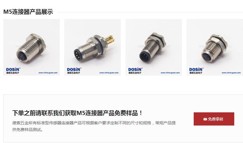 目前M5連接器專題頁面:http://m.shangxuncn.com/sensor-connector/m5-connector/?已上傳了上千款優質M5產品,均是我們工廠出過貨的,規格型號齊全,涵蓋了大部分客戶的M5產品需求。若是瀏覽了大量產品之后,依然沒有找到合適的M5連接器產品,您可以向在線工防師描述您的需求,然后我們為您繪畫圖紙,進行定做。“連接器M5粗牙螺紋螺距是多少”這篇文章中使用的配圖均來自德索連接器廠家的攝影團隊高清拍攝,僅供本站用戶查閱,請勿轉載自商業用途,謝謝配合。