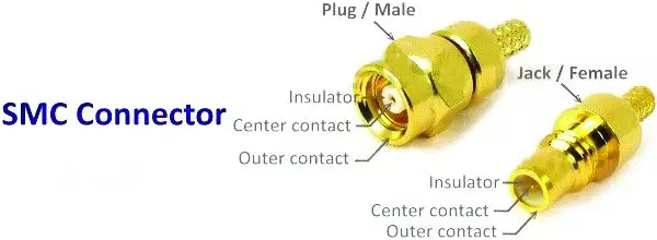 SMC的全稱是SubMiniature version C,也是1960年代發(fā)明的射頻同軸連接器。它采用#10-32 UNF螺紋接口,在直流到10GHz范圍內(nèi)可以提供優(yōu)秀的電氣性能。SMC公頭有外部螺紋,SMC母頭上有配套螺母。特性阻抗有2種:50歐姆與75歐姆,它為小型同軸線纜及對(duì)于尺寸非常在意的印刷電路板提供了互聯(lián)方式。