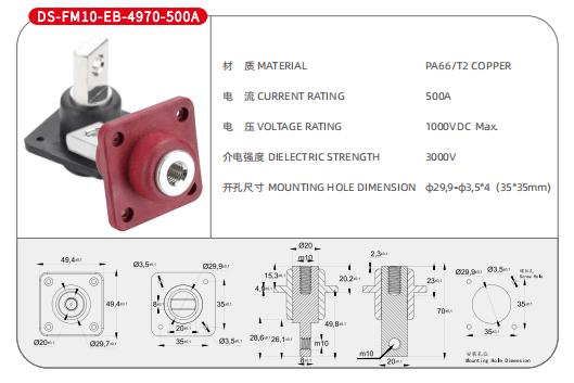 法蘭500A穿墻式接線柱內螺紋M10銅牌M10黑色