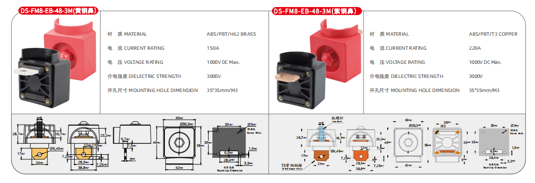 英文描述:Feed Through Junction Blocks, 150A,Outer Screw(M8), Red