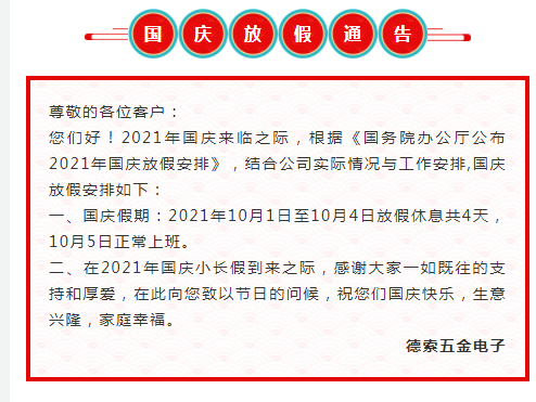 我們祖國的生日又到,1949年10月1日下午3時,北京30萬人在天安門廣場隆重舉行典禮,慶祝中華人民共和國中央人民政府成立, 從此開啟新世界大門。在這個舉國同慶的日子里,德索五金電子在此送您五千萬:千萬要快樂,千萬要健康,千萬要平安,千萬要發(fā)財,重要的一點,是千萬不要忘記我喲!