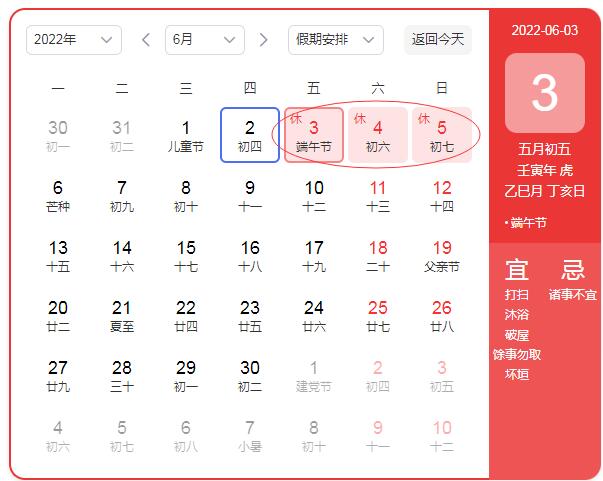 2025年5月31日(星期六)至6月2日(星期一)放假,共3天。6月3日(星期二)正常上班。