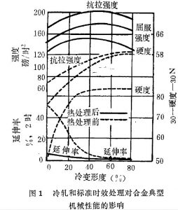 2.Brush 25合金。是一種新型的高強度被銅合金。其化學成分為:被1.8^-2.0%,鉆+鎳>0.2%,鉆+鎳+鐵<0.6%,銅余量。圖1所示為冷軋和標準時效處理對合金典型機械性能的影響。該合金通過冷軋和時效處理后,可獲得銅基合金所能達到的最高強度和硬度。該合金最大優點在于,零件成型后可通過時效硬化得到強化。可用作導電彈簧、觸點、接插件、開關閘刀、接線柱、保險絲夾、膜片和波紋管等。