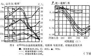 有關文獻介紹了一種牌號為s7KH5s的導電彈性合金。該合金在400℃-500℃的高溫下仍具有很高的松弛穩定性,并兼有相當低的電阻率(0.27~0.3歐·毫米“/米)。它可用來制造導電彈簧,特別是各類繼電器的片狀導電彈簧。圖2所示為該合金的抗張強度、電阻率與變形度、時效溫度的關系。表5列出了變形度為40和70%,并經最佳溫度時效后的物理一機械性能。
