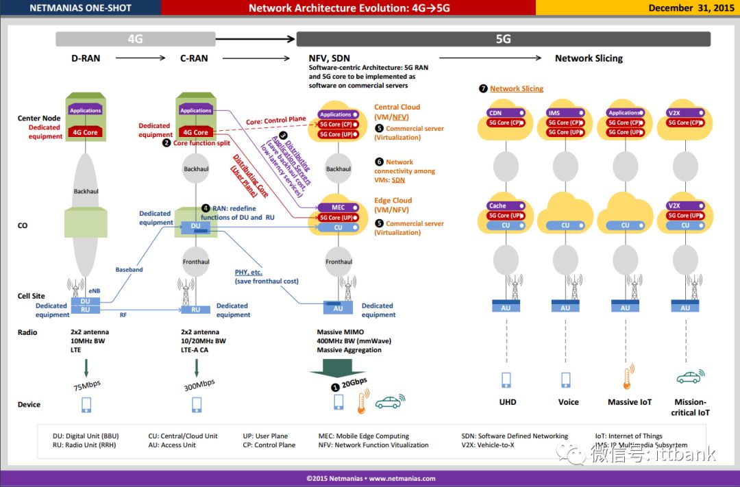 無線接入側的變化就相對很大了。上圖有兩個基本概念,BBU(上圖中的DU)和RRU(上圖中的RU,有時也叫RRH)。BBU就是基帶單元(baseband unit),一般生成與處理數字基頻RF信號;RRU則為射頻拉遠單元(remote radio unit)。3G時代BBU和RRU實現了設備分離;不過如上圖所示,3G、4G時期盛行的D-RAN(分布式無線接入網),BBU和RRU還是放在同一個機柜中的。