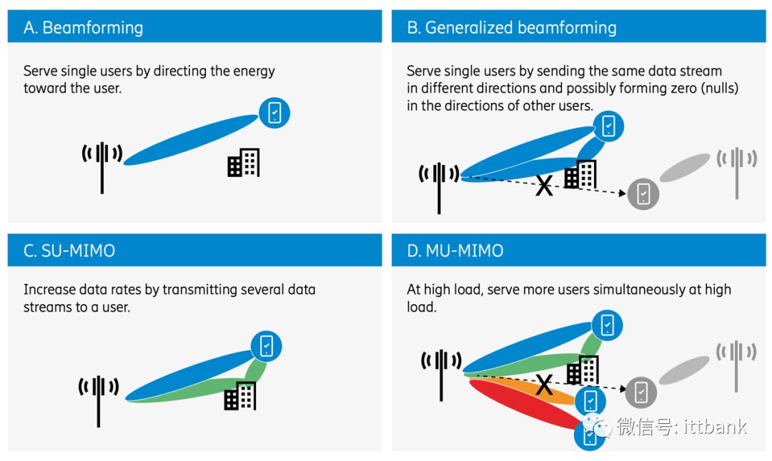 AAS系統的主要作用有兩個,其一是有源天線可將信號專注到一個特定的方向,這樣一來從基站抵達特定設備的信號也就更強,這就是Beamforming波束成形技術。第二,這里的天線陣列就是MIMO天線,通過多個無線信道同時服務多用戶,實現MU-MIMO。